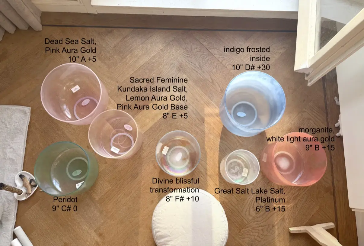 Each Crystal Tones® bowl is a masterpiece of sound and spirit—infused with precious elements (see below for details on my current set). These bowls carry unique frequencies to support your personal healing and meditation journey. Book a crystal bowl matching session and find the right vibration for your energy with expert guidance.